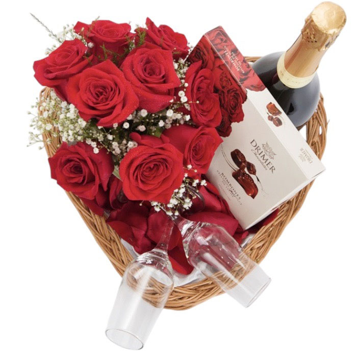 1 Bandeja de mimbre en forma de corazón, 1 Florero con 9 rosas importadas, 1 botella de Champagne, 2 copas y 1 caja de 12 bombones rellenos con dulce de leche.