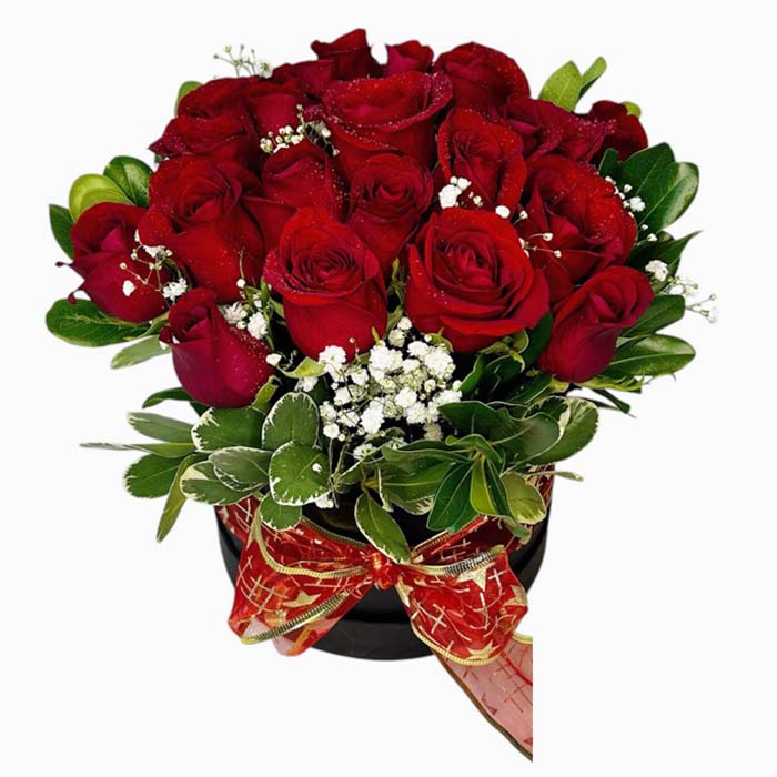 Caja redonda con 24 rosas tallo largo (consultar por colores disponibles). Incluye esponja floral y mensaje de regalo.