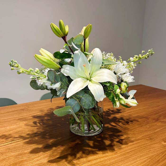 Centro de Mesa – Florero cuadrado con Alstroemerias
