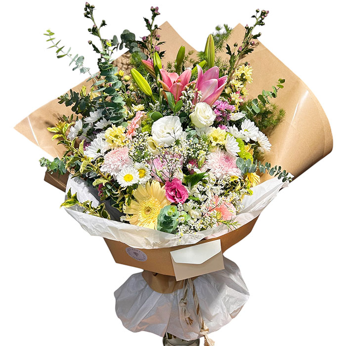 Este delicado ramo premium combina flores de estación cuidadosamente seleccionadas en una armonía de tonos rosados, pastel y follajes naturales. Lilium, y flores de estación complementarias se integran con follajes frescos para lograr un arreglo elegante, luminoso y lleno de vida, ideal para transmitir cariño, gratitud o celebración.